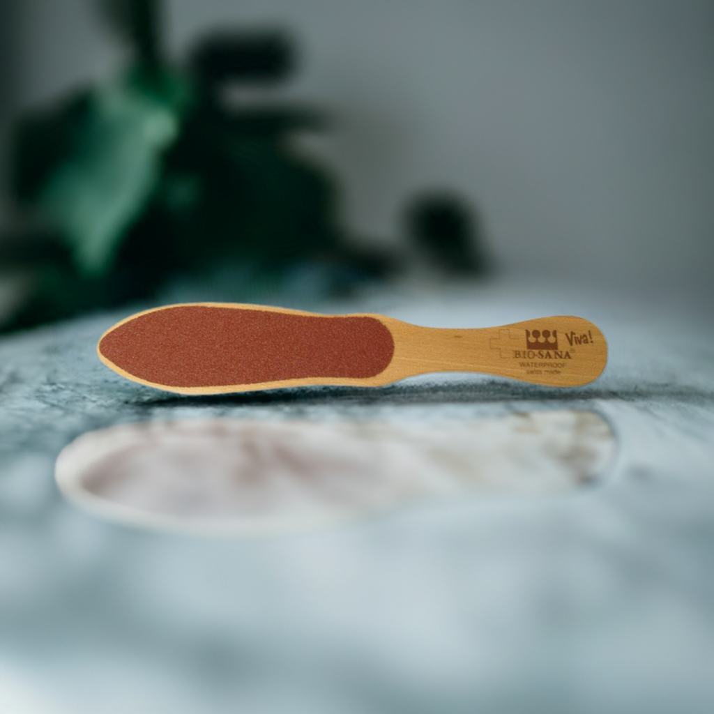 Uit essenhout vervaardigde voetrasp voor het verwijderen van eelt. 2-zijdig te gebruiken: groffe zijde en fijne zijde om verhoornde huid glad te maken. Waterbestendig.