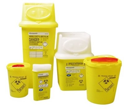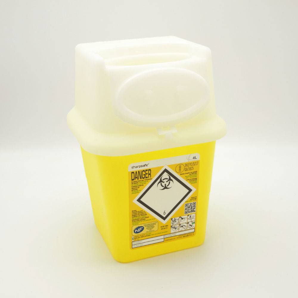 Afvalcontainer voor Risicohoudend Medisch Materiaal met veiligheidsklep. Container voor scherpe, snijdende en prikkende voorwerpen (SSPV) bestemd voor verzorgingsdiensten.